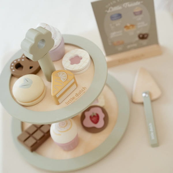 Piętrowa, drewniana patera na słodkości od Little Dutch. W zestawie znajdują się różnego rodzaju ciasteczka, szpatułka do ciasta oraz papierowe menu.